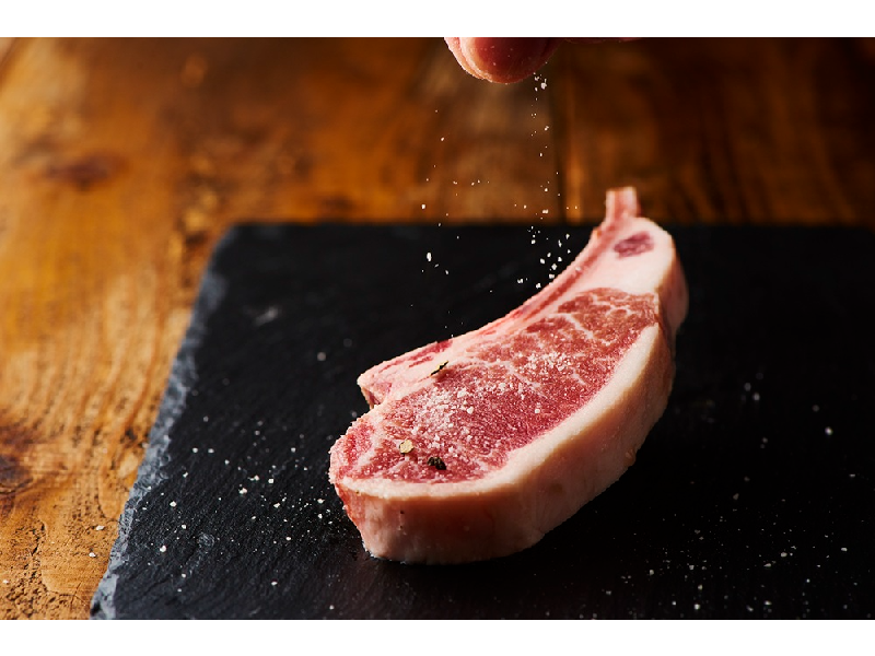 骨の周りが美味しいイベリコ豚の骨付きステーキ。香りが抜群に良いトリュフ塩が肉のうまみを引き立たせてくれます。