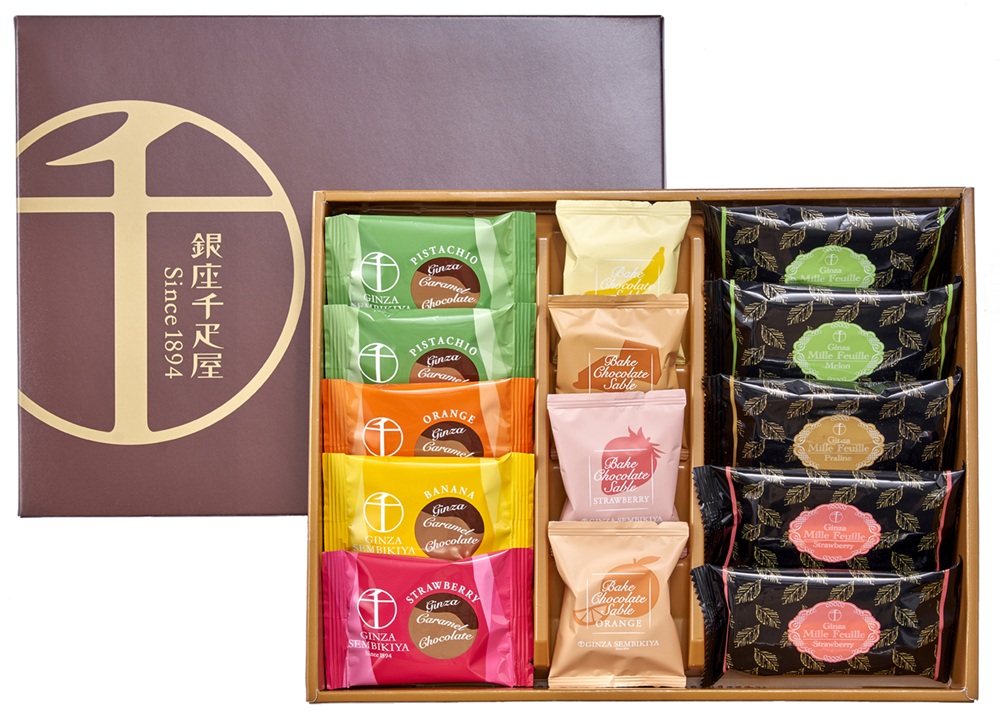 【常温】銀座ミルフィーユ(メロン、ストロベリー 各2個、プラリネ1個)銀座焼きショコラサブレ(オレンジ、ストロベリー、バナナ、キャラメル 各1個)、銀座キャラメルショコラ(ストロベリー、バナナ、オレンジ 各1個、ピスタチオ2個)