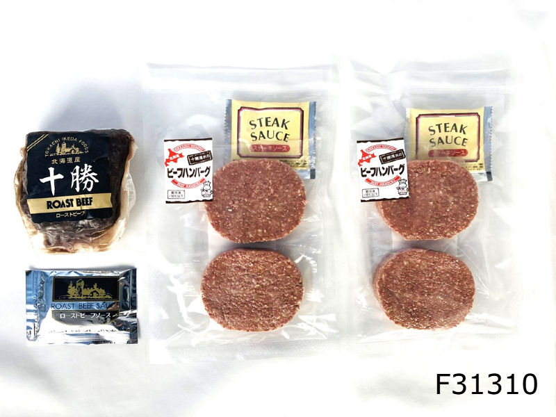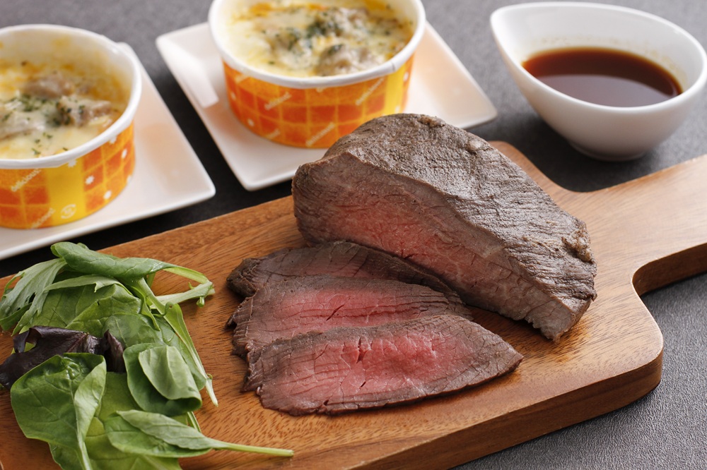 ローストビーフは、牛もも肉を使用することでしっかりとした肉感を味わえます。ハンバーグは、北海道有数の酪農地帯である十勝清水町で育った十勝清水牛肉100%のビーフハンバーグです。