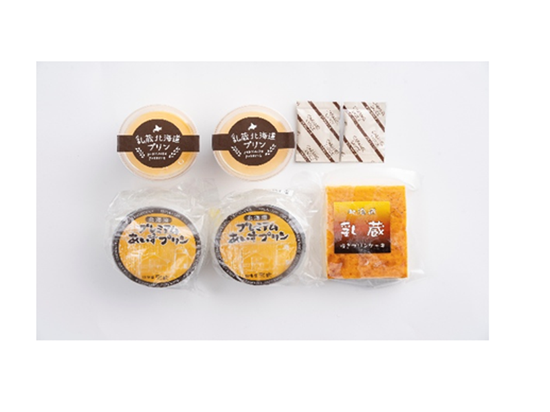 【冷凍】焼きプリンケーキ100g×1、北海道プリン100g×2、 カラメルソース5g×2、あいすプリン(約65g)×2