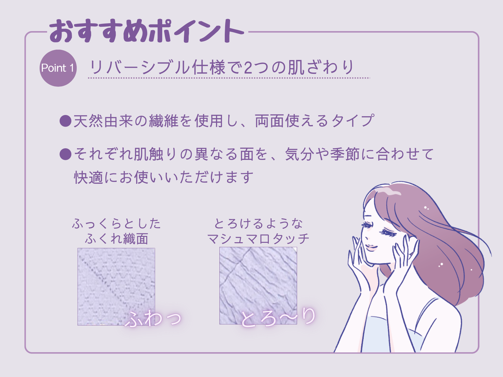 とろけるようなふわふわな面と、ふっくらとした肌触りの面を使い分けできるため、気分や季節に合わせて快適にお使いいただけます。