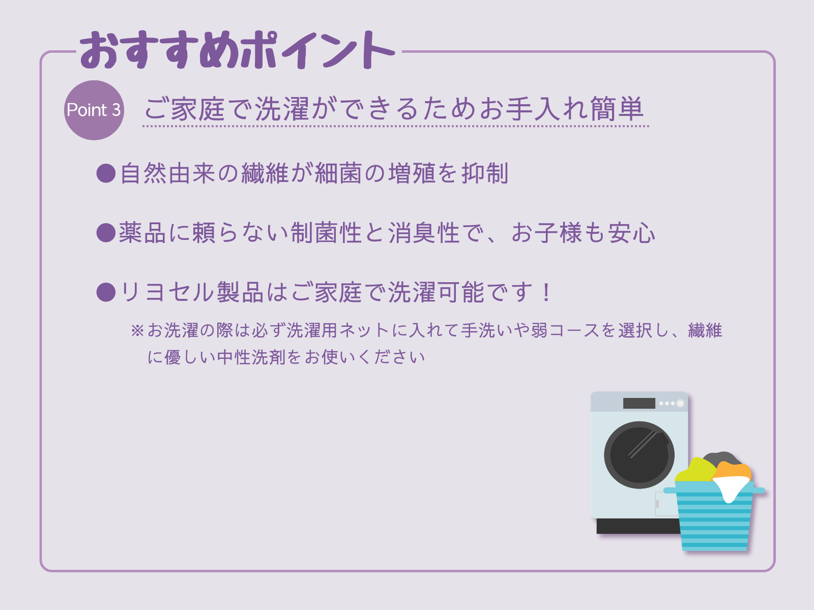 【おすすめポイント③】ご家庭で洗濯ができるためお手入れ簡単
