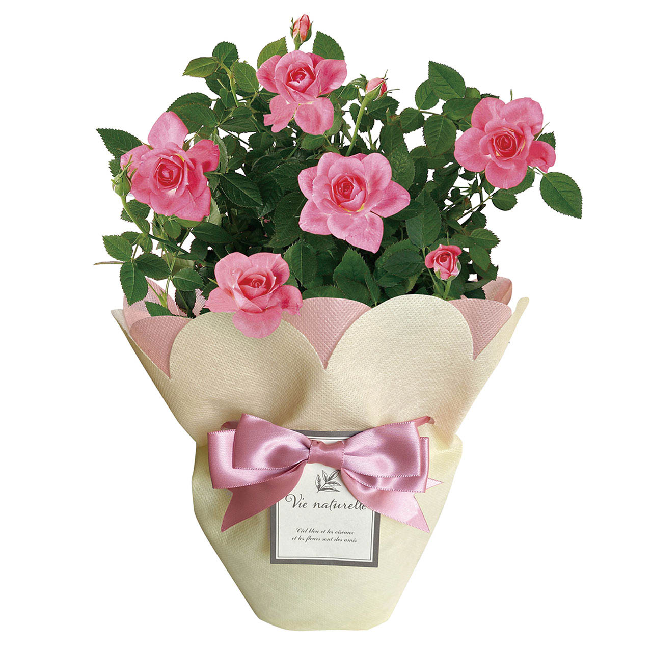 内容物:ミニバラ(ピンク)4号1鉢、バスケットもしくはラッピングバッグ、取扱いの手引き